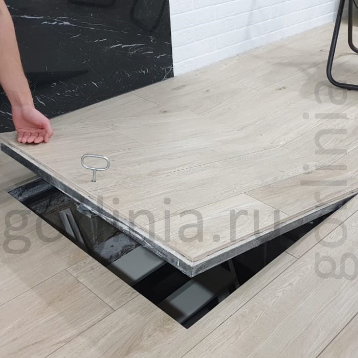Рама без наличников выставляется в существующем отверстии 100*100 см с допусками, крепится в перекрытии через вертикальные пластины даже когда Ваш ремонт закончен и пол выложен керамогранитом или настелена ламинированная доска.