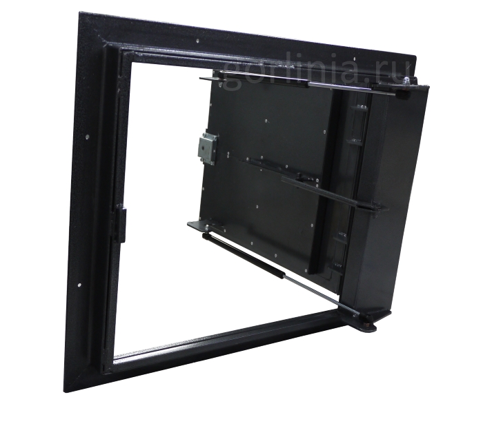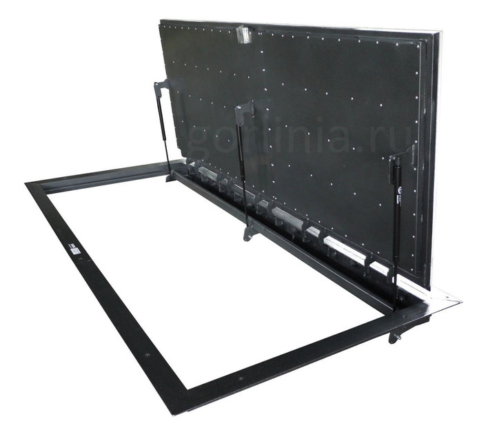 Рама выпускается из устойчивого к кручению-короблению горячекатаного уголка, крепится на плиту перекрытия в нулевую отметку пола после заливки стяжки и уверенно держит давление газовых упоров при закрывании механизма. Коробку и элементы навесов из гнутой стали ХД на таких размерах не рекомендуем.