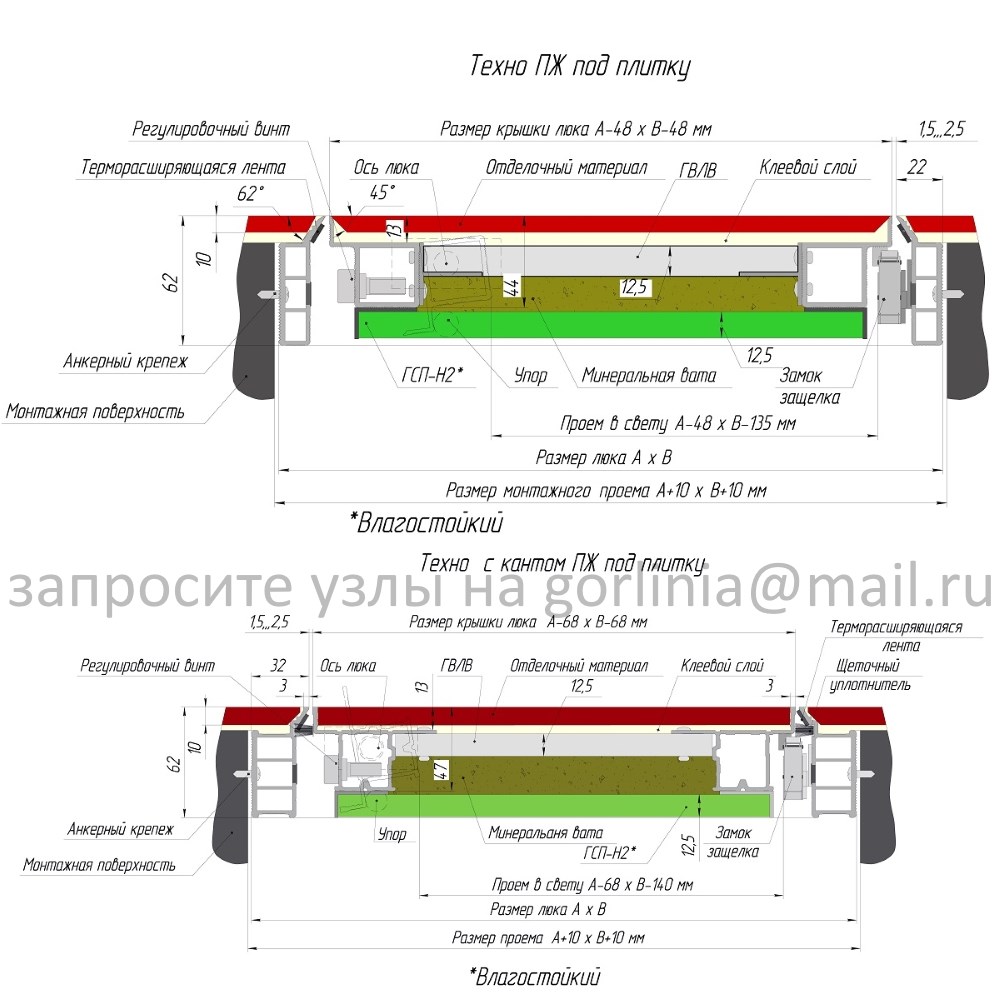 Монтажный размер 600*1600п со скрытой коробкой из алюминиевого профиля глубиной 62 мм. Полотно 552*1152 заполнено гипсоволокнистый лист влагостойкий "Knauf", внутри проложена минеральная вата и подшита ГСП-Н2 с внутренней стороны. По контуру притвора проклеена терморасширяющаяся лента.